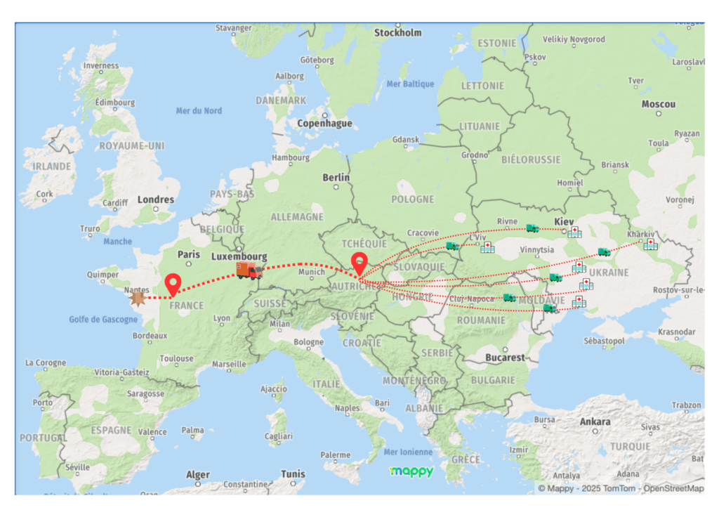 Étape 4 : Leonding (Autriche) → Hôpitaux d’Ukraine des villes de Kiev, Karkhiv, Lviv, Kropyvnytskyï, Mikholaiv et Odessa : la collecte redispatchée sera rechargée sur des camions depuis le site Autrichien puis envoyée directement aux hôpitaux ukrainiens où le matériel est nécessaire